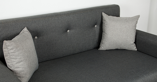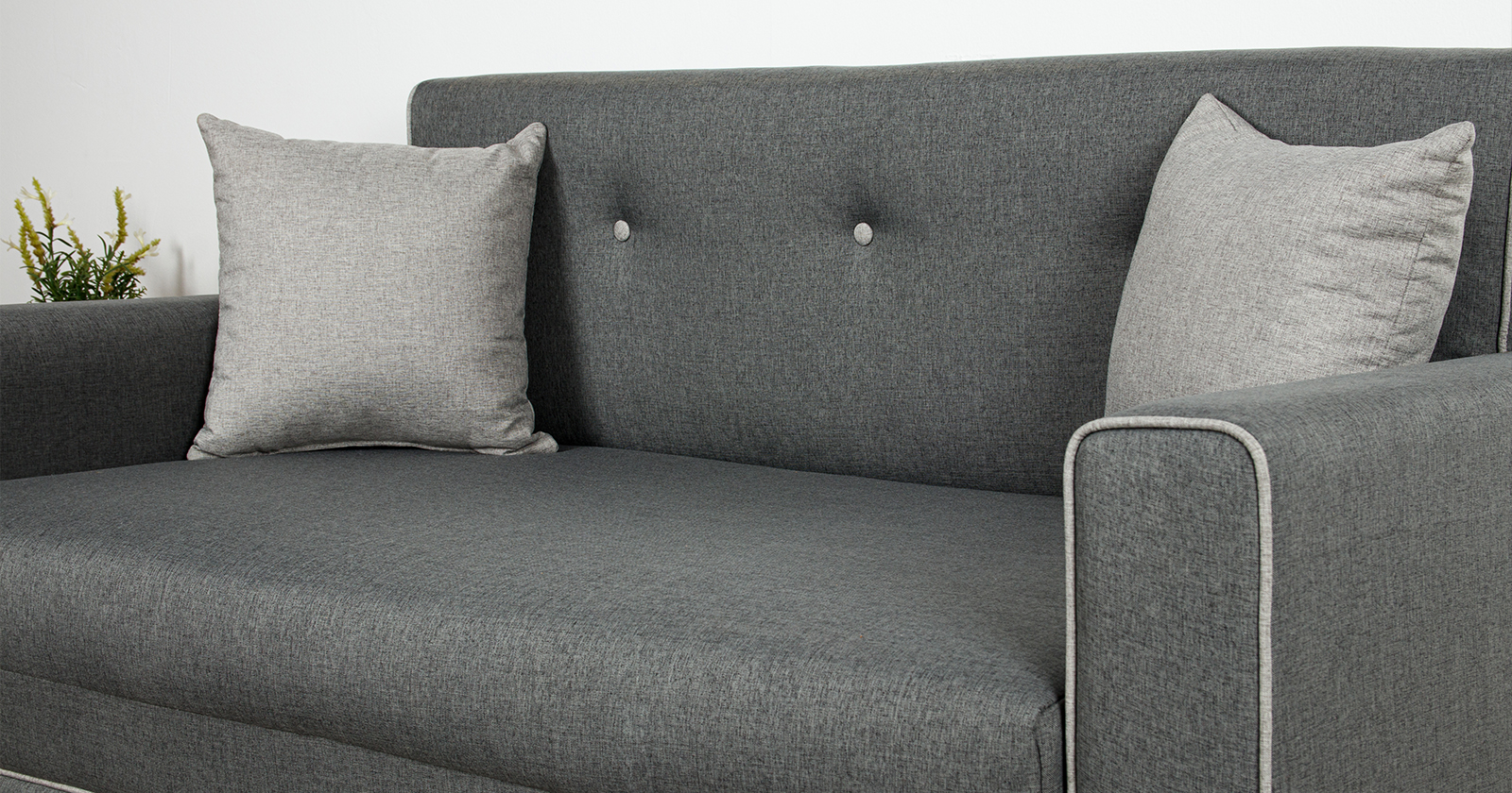 Декоративный контрастный кант по торцу спинки, торцу подлокотника, по верхнему срезу царги. Утяжки с пуговицами на спинке дивана. Две декоративные подушки в контрастной ткани.