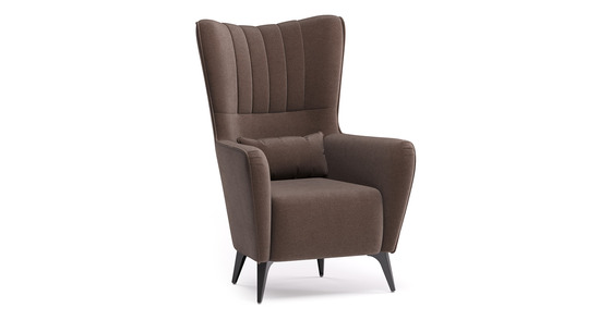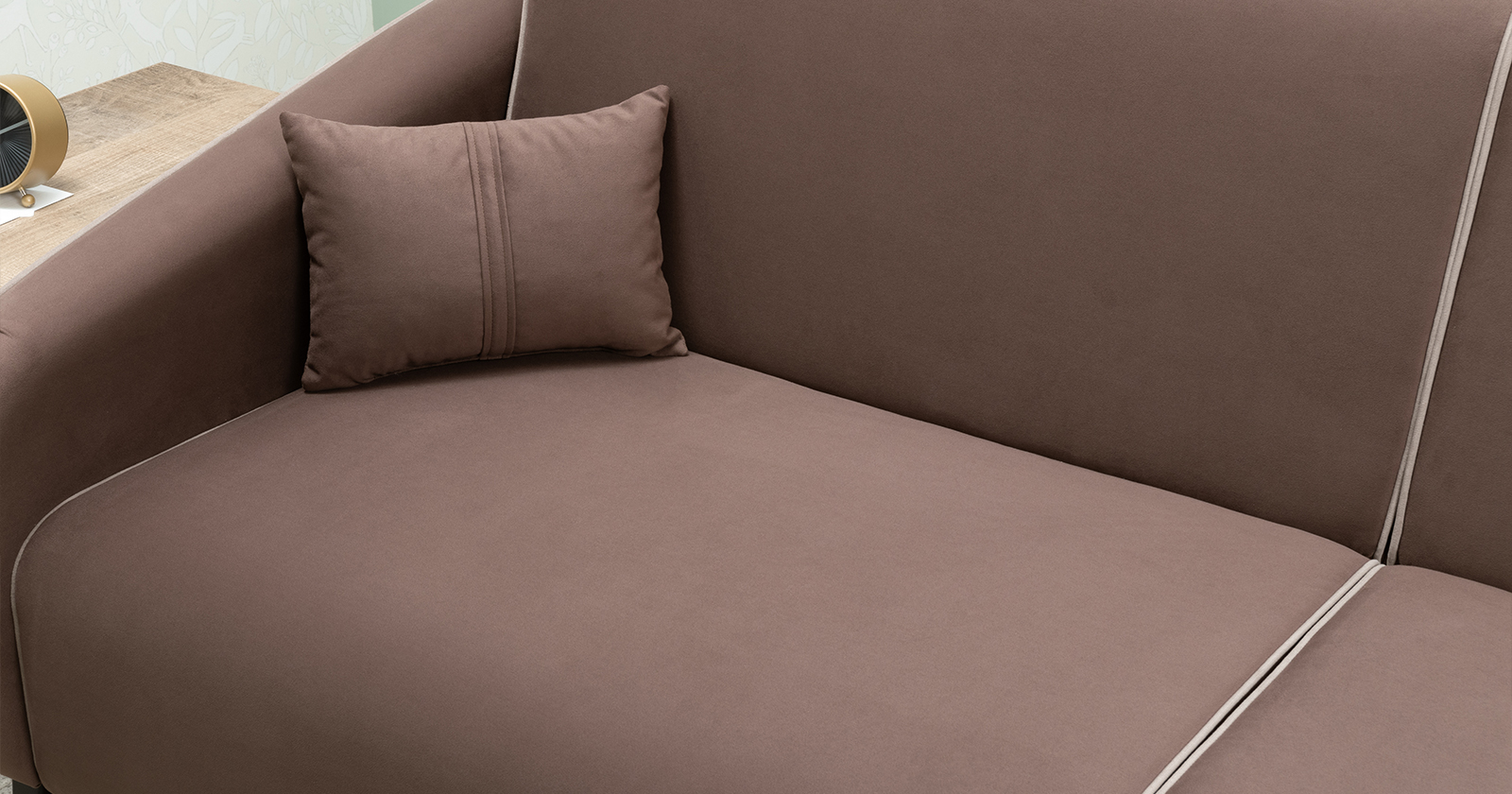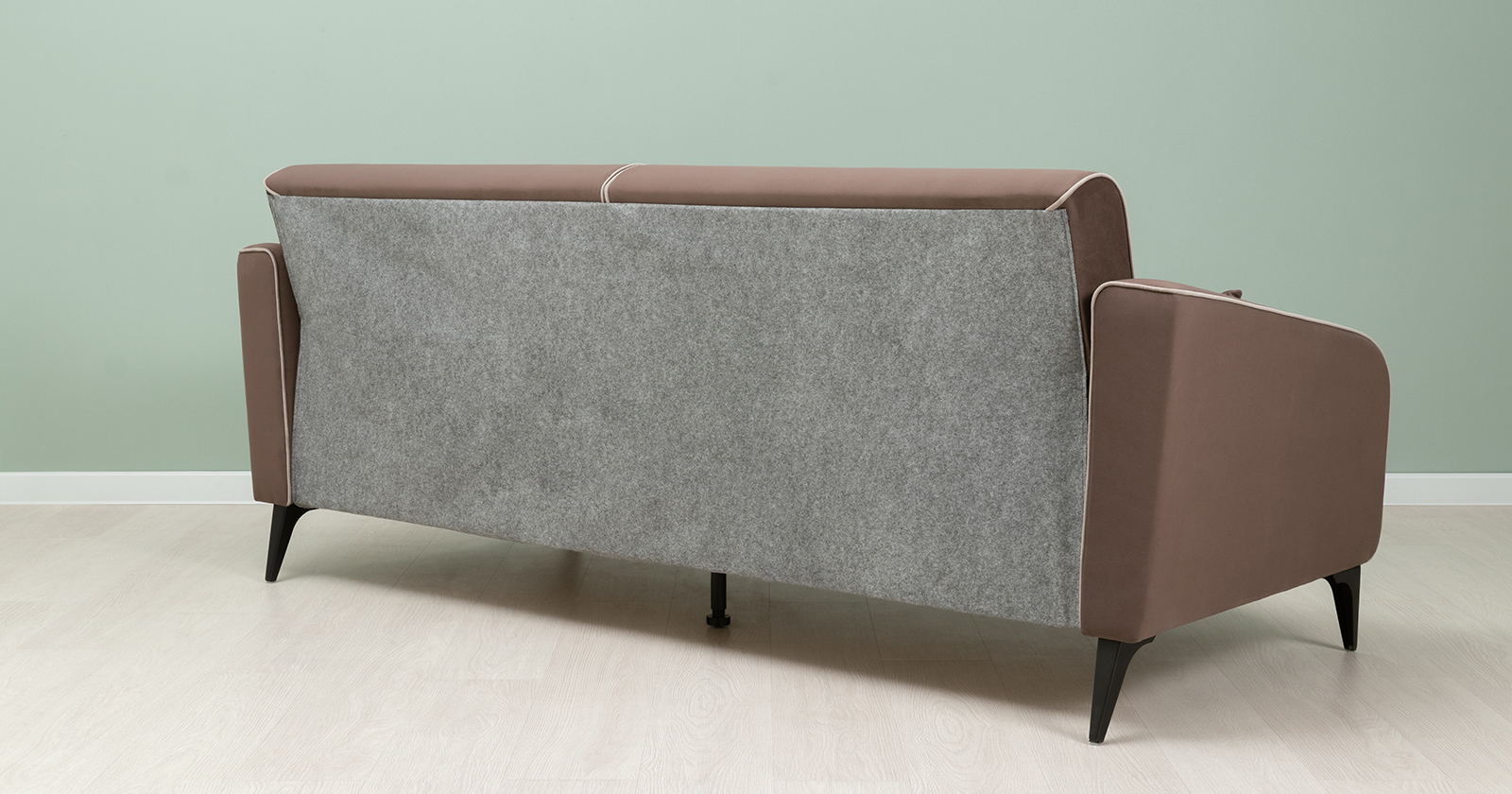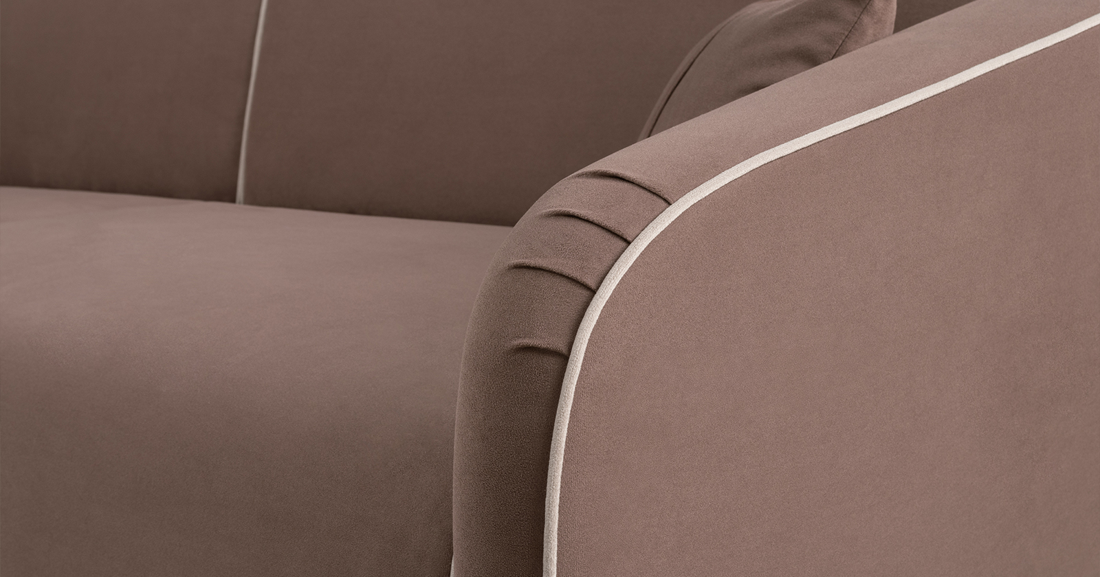 Спинка и сиденье разделяются пополам двойным кантом по центру и одинарным по краям сидения, для придания одной единой формы. Подлокотники с изгибом на лицевой стороне и мягкими закругленным углом со складками, с выраженным контрастным ровным кантом по внешнему контуру изделия и изогнутой линией канта.