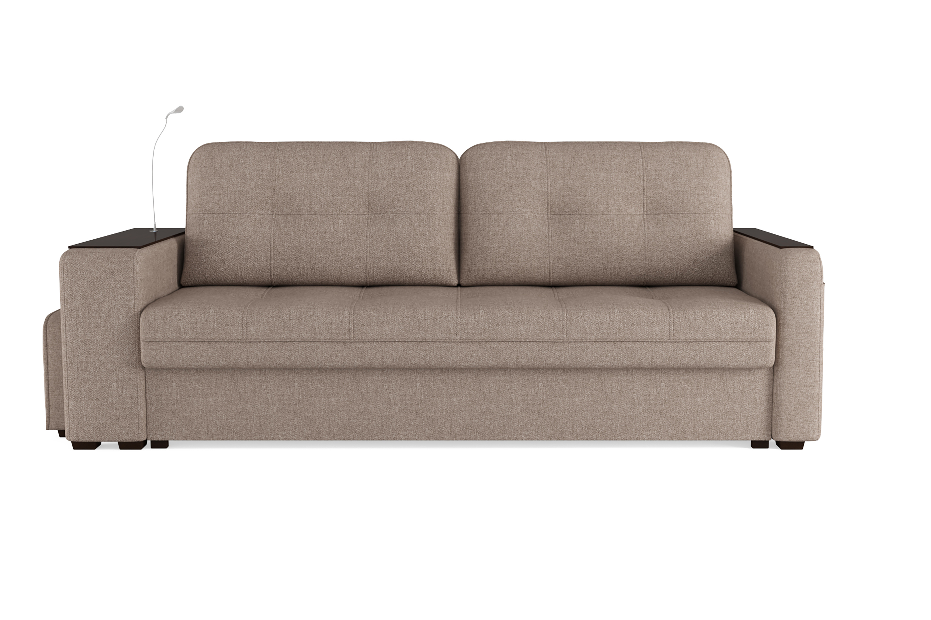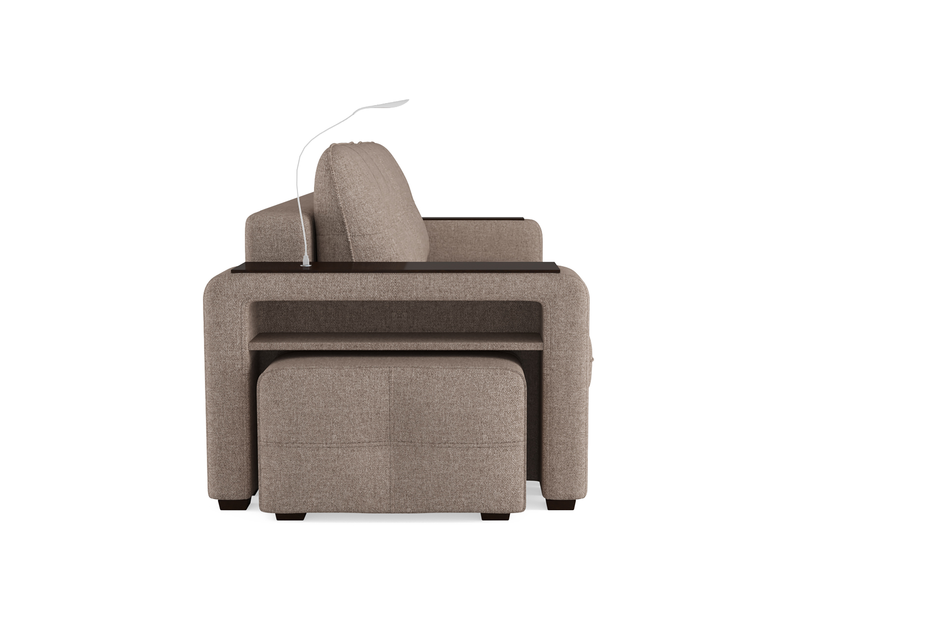 Диван «SMART 4» — это не просто мягкая мебель, а один из ключевых элементов интерьера с обширным функционалом, где эстетика тесно соседствует с комфортом и эргономичностью.  Одна боковина оснащена карманом для хранения мелочей и гаджетов, другая боковина совмещает одновременно: рабочую поверхность, за счет широкой накладки, двойной  usb - порт  и портативную лампу точечного света, которая входит в комплект. Добавить контрастных деталей в интерьер поможет пуф, интегрированный в подлокотник. Этот вариант для современных людей, которые ценят комфорт и удобство отдыха. Мягкое сиденье с легкостью трансформируется в просторное спальное место, на котором смогут утроиться ваши гости. Стильный и уютный, он станет отличным решением, если вы ищите не только красоту, но и комфорт.