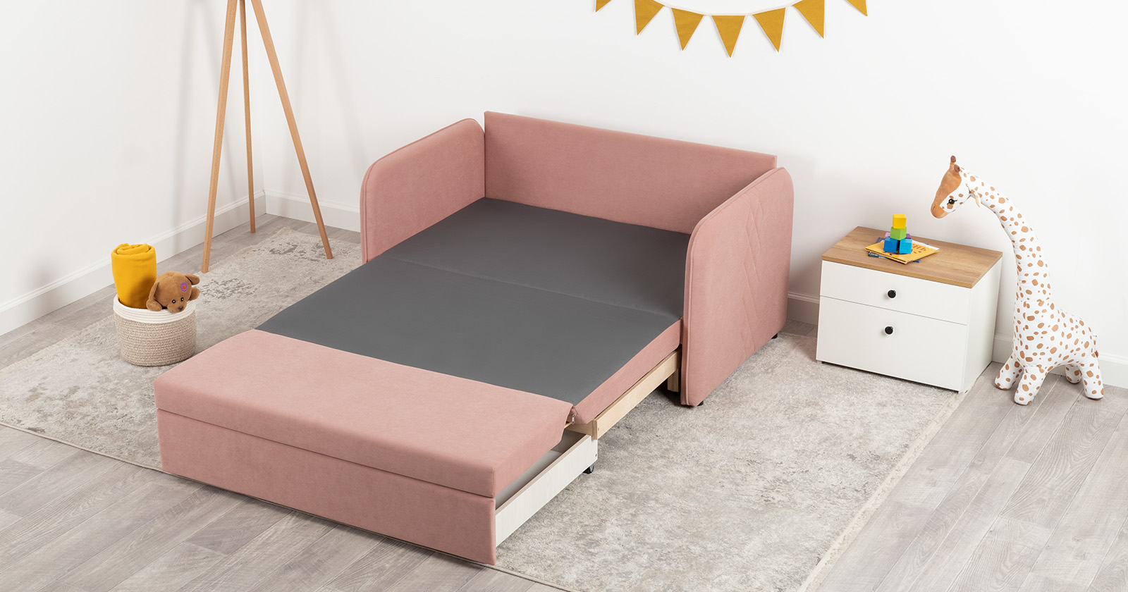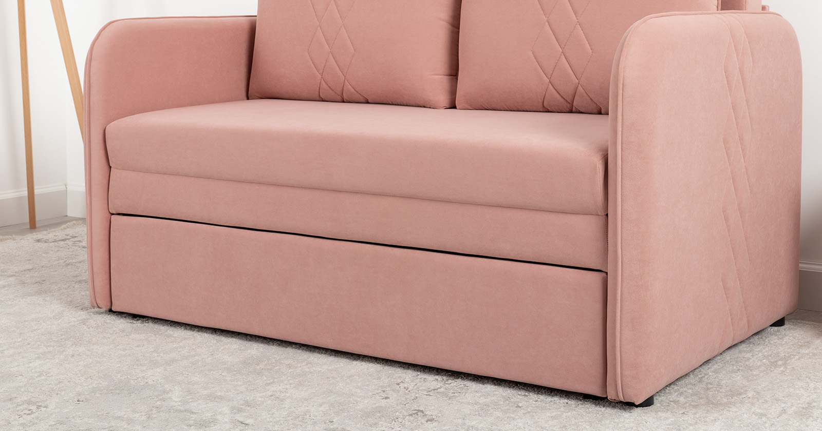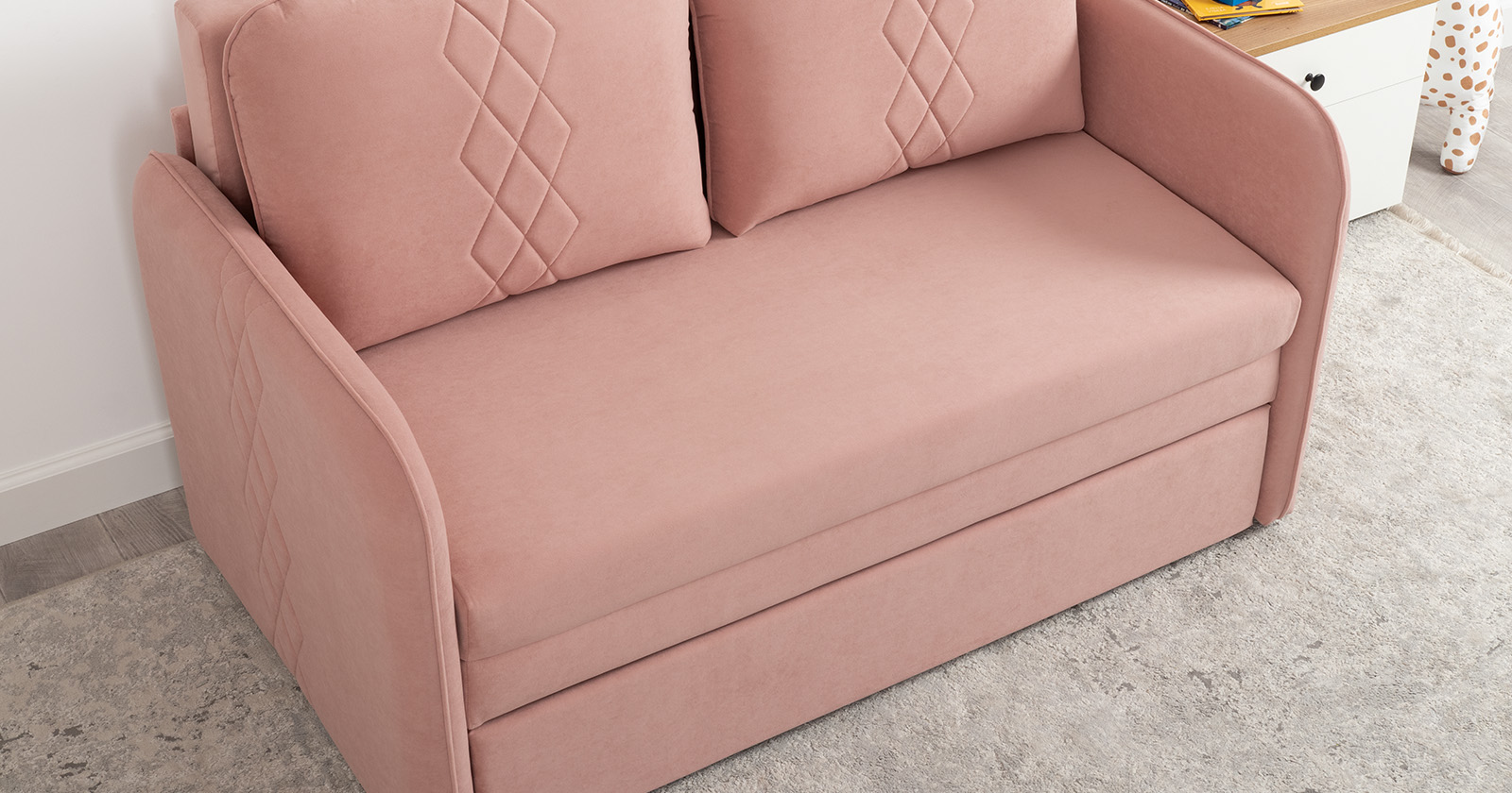 Стильный компактный диван для детской и гостиной. При своих скромных размерах он трансформируется в полноценное спальное место для детей и подростков. Лаконичный дизайн в виде декоративной стежки подчеркивает фактуру велюра, а небольшие размеры позволят разместить его в любом пространстве.