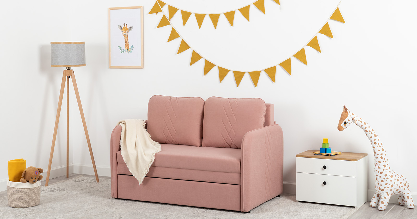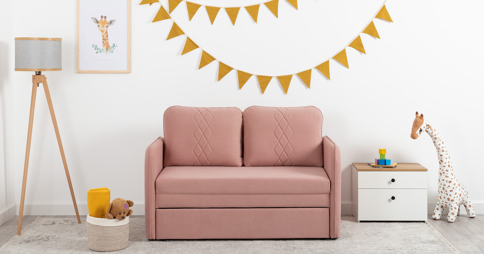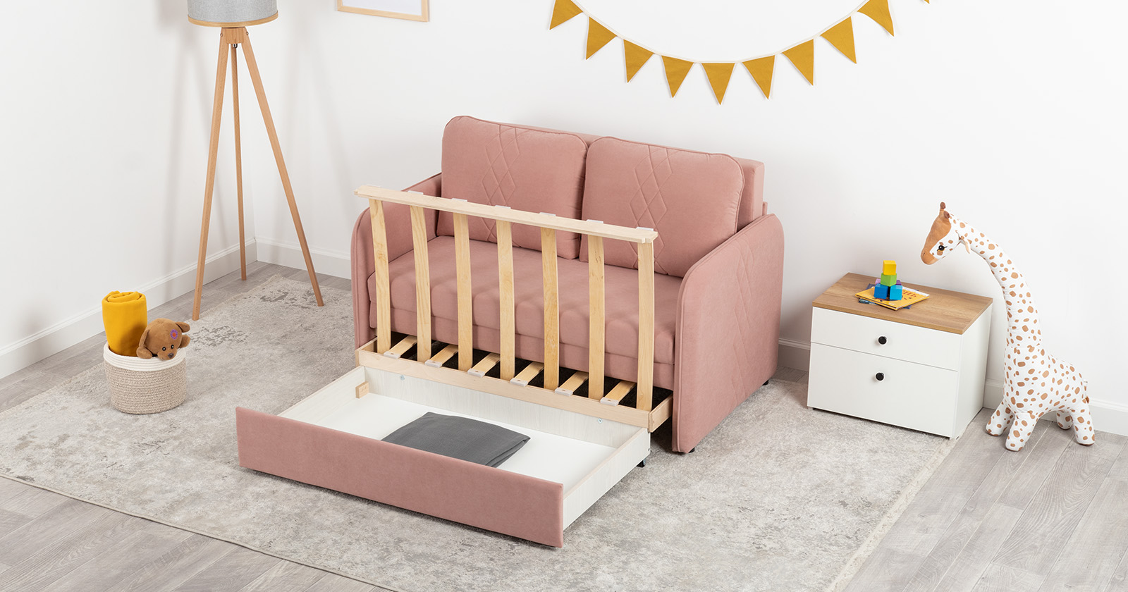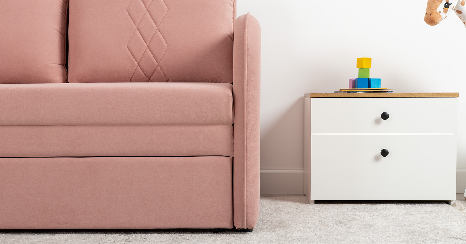 Стильный компактный диван для детской и гостиной. При своих скромных размерах он трансформируется в полноценное спальное место для детей и подростков. Лаконичный дизайн в виде декоративной стежки подчеркивает фактуру велюра, а небольшие размеры позволят разместить его в любом пространстве.