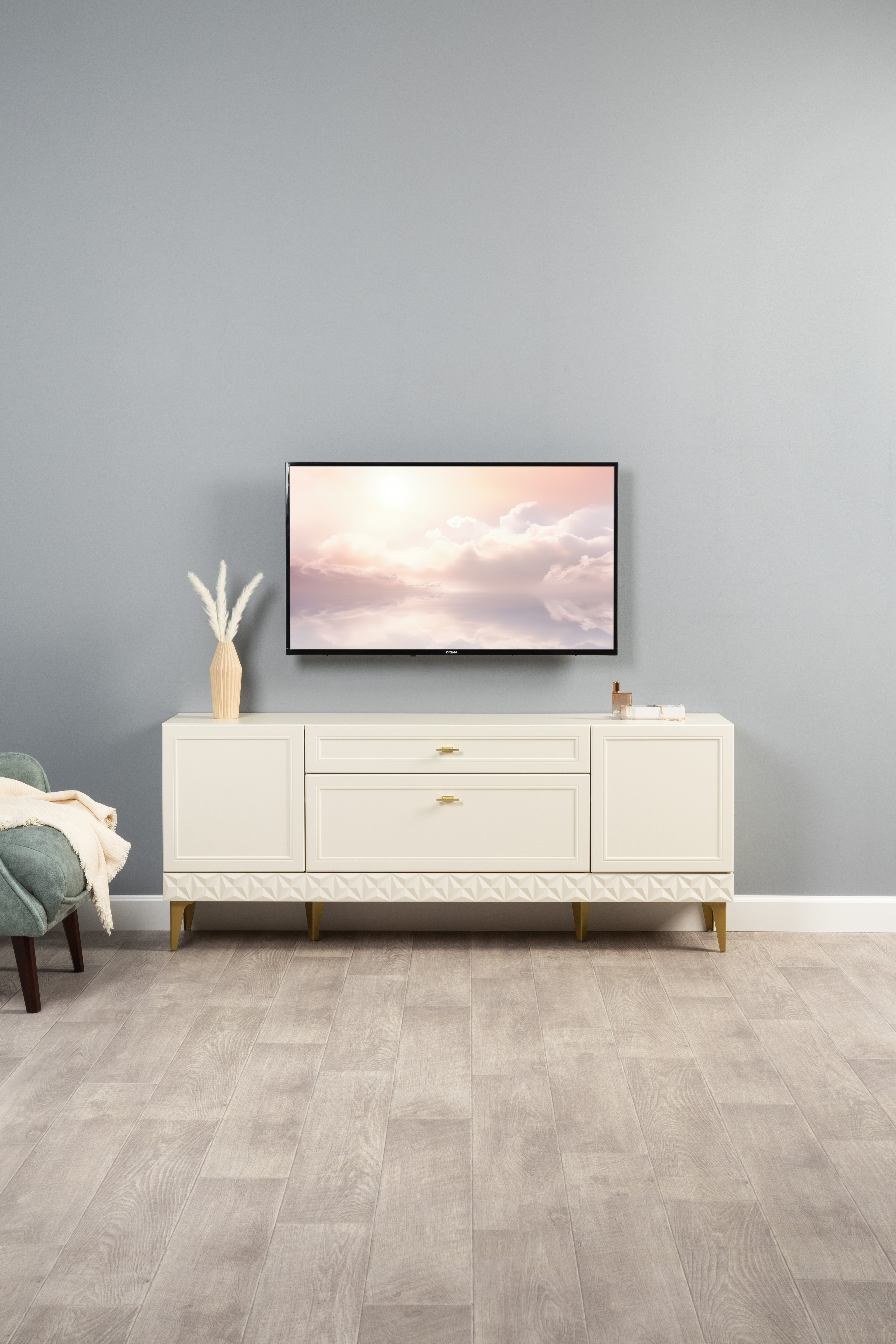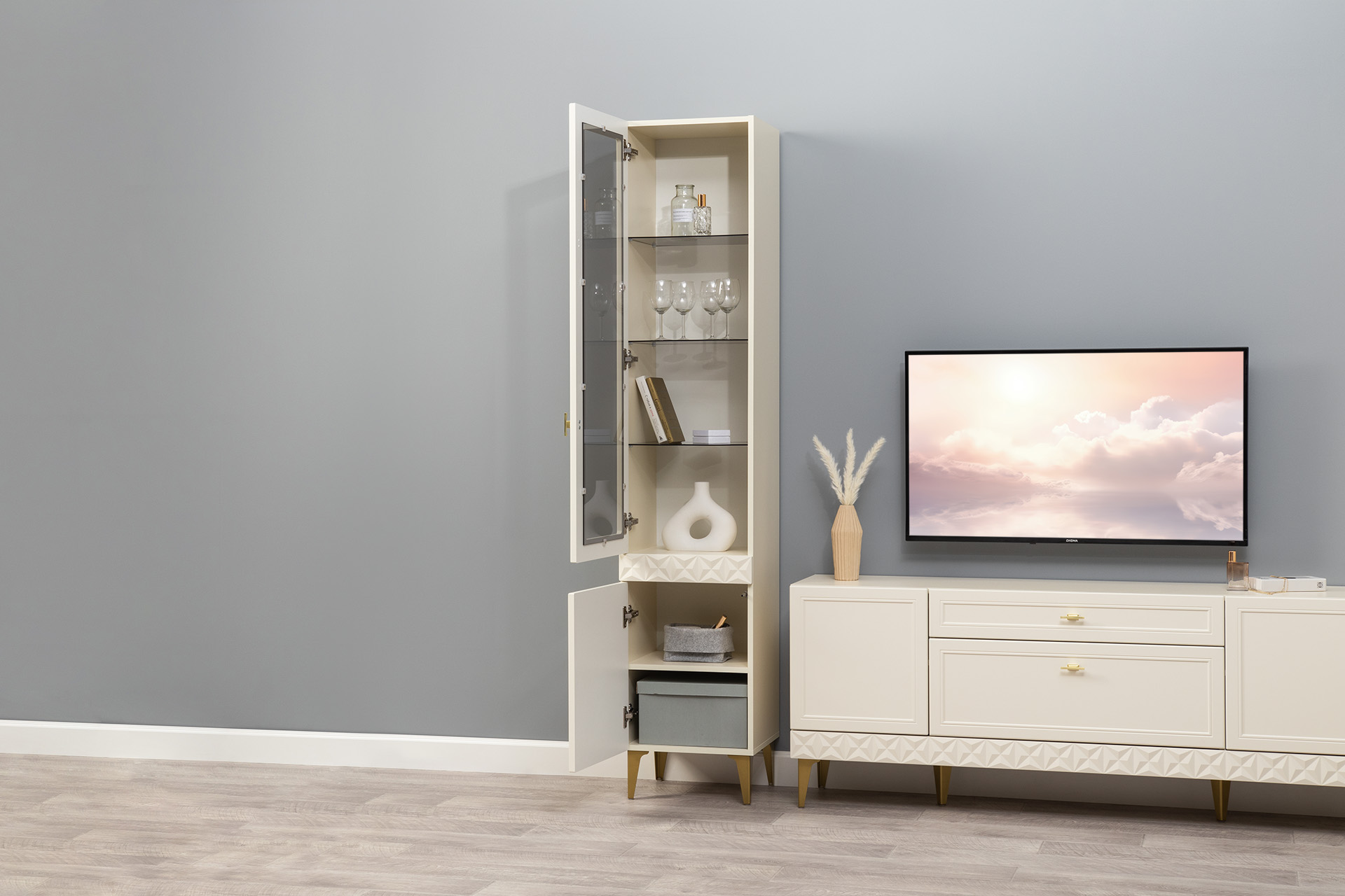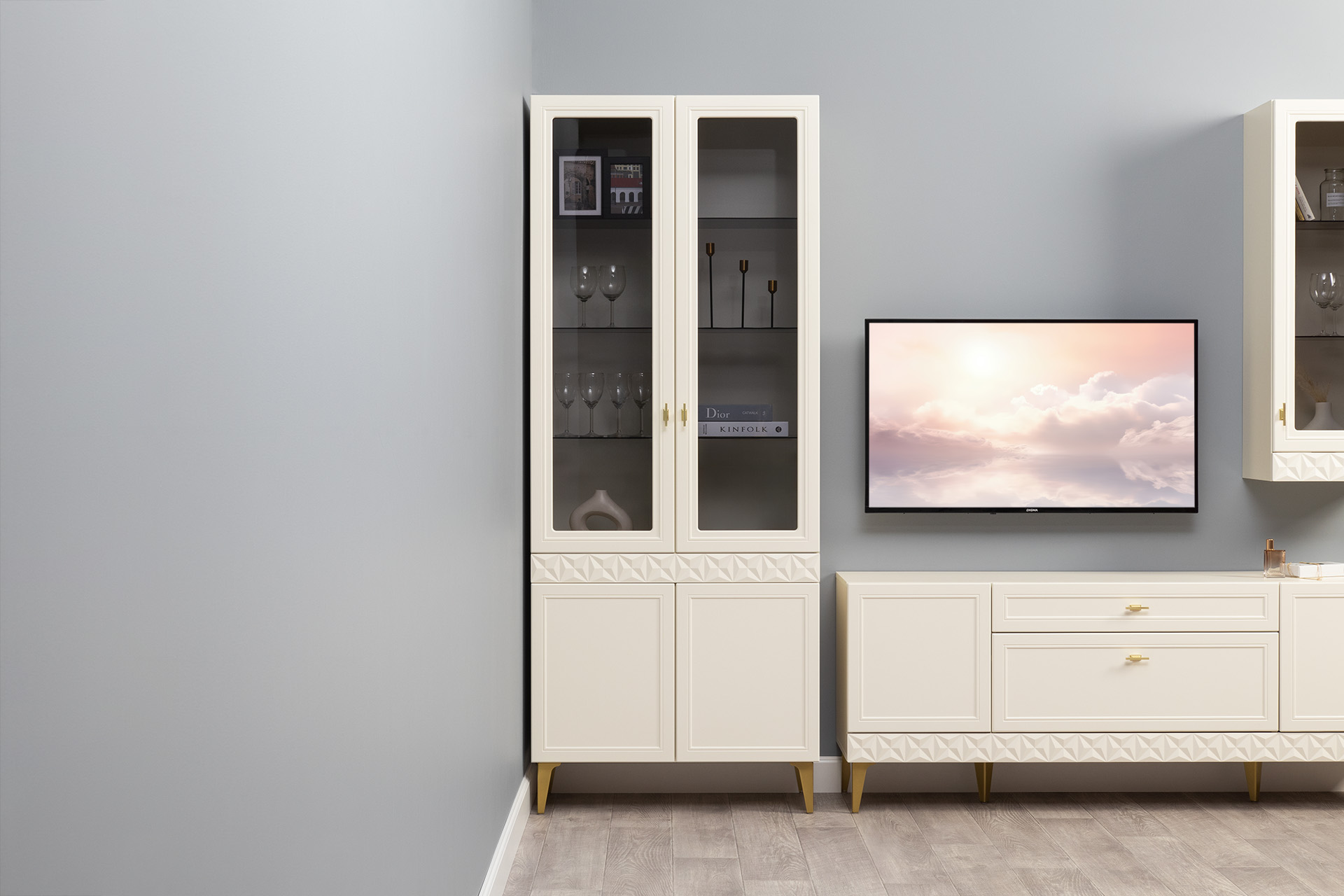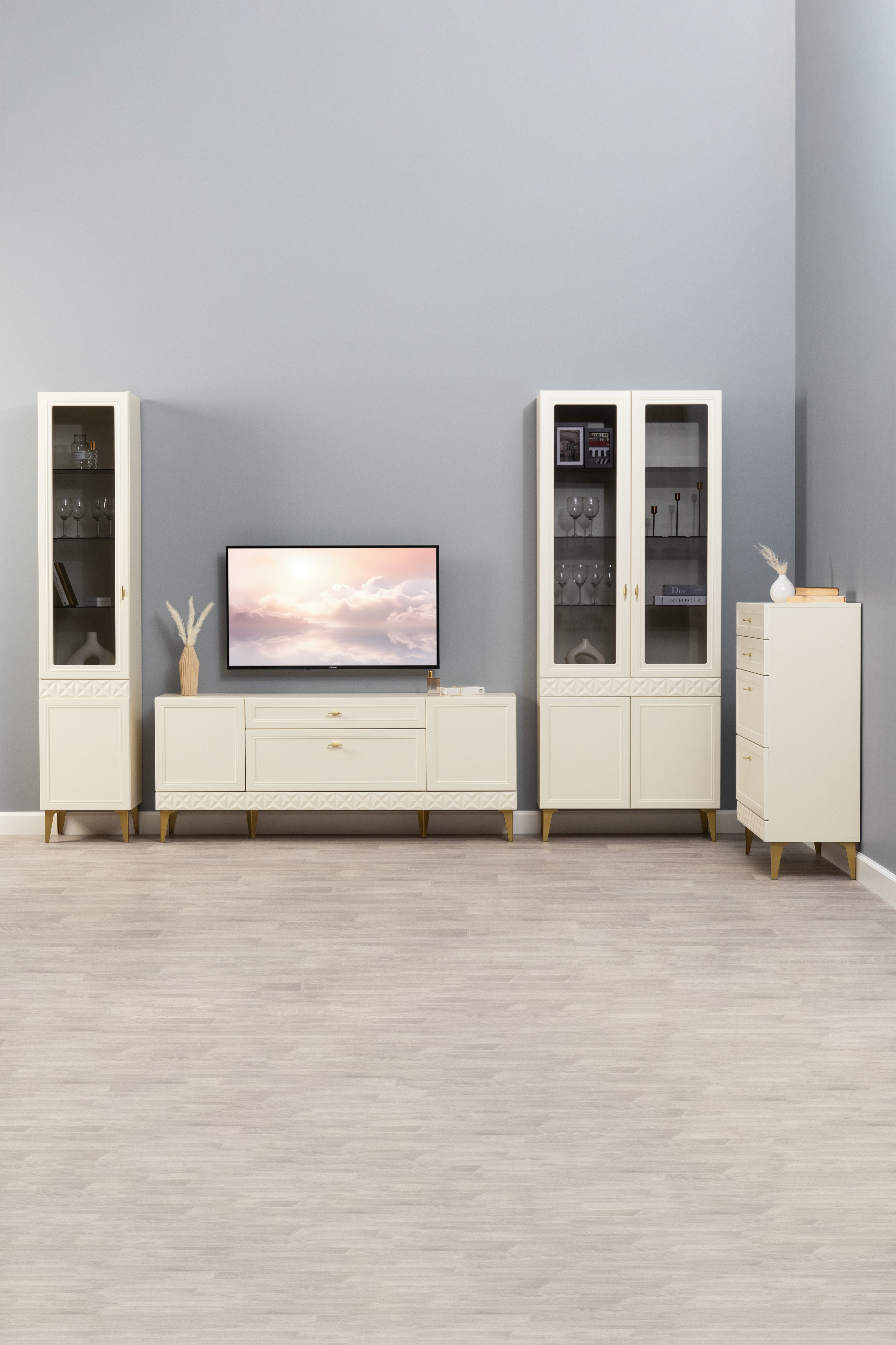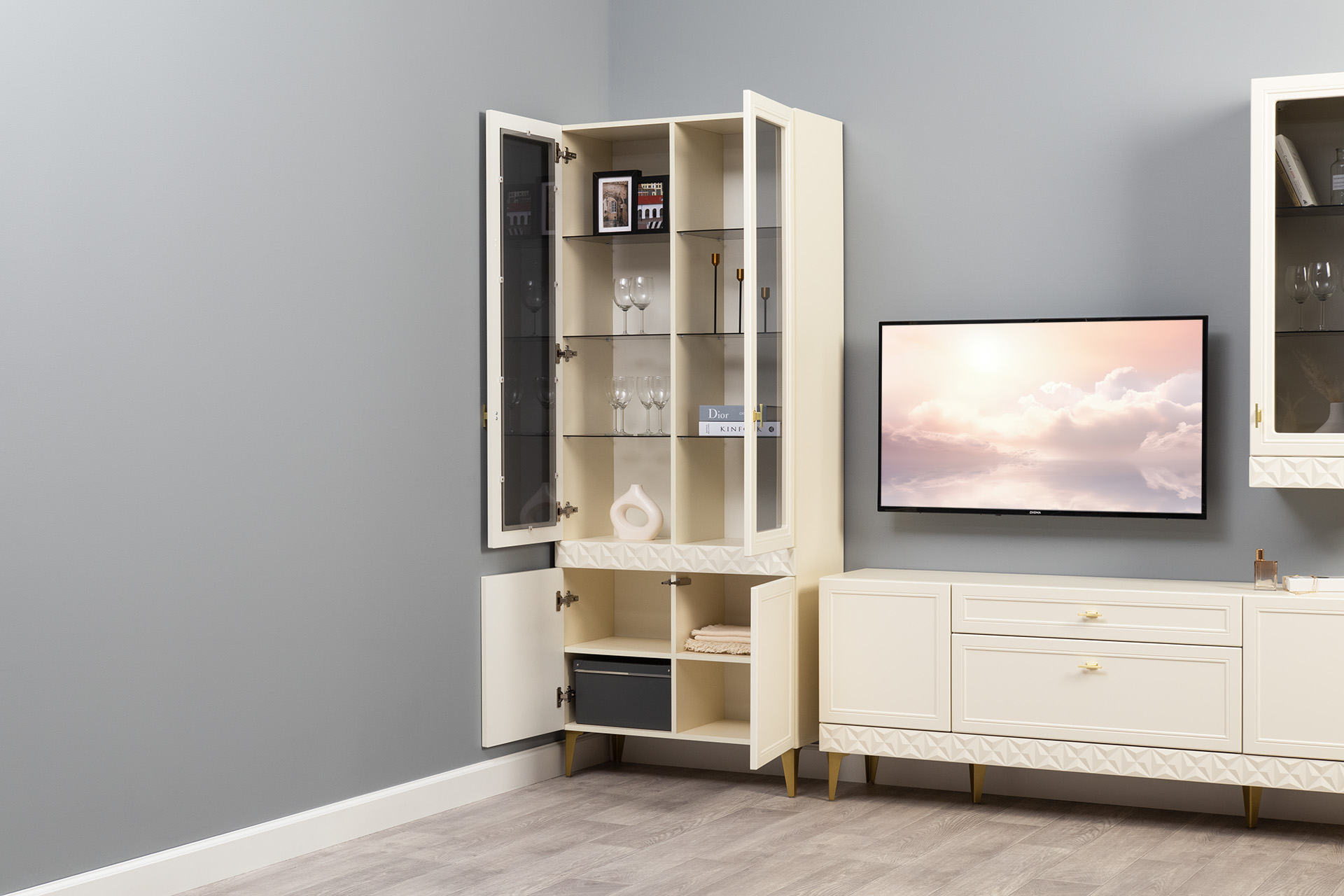 Гостиная Марион композиция 1 слоновая кость С341 PE, слоновая кость 6898 ПВХ, белый PE шагрень (собирается на любую сторону)