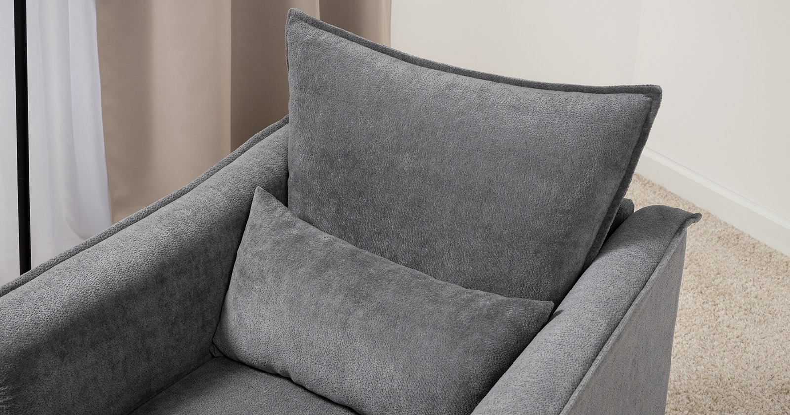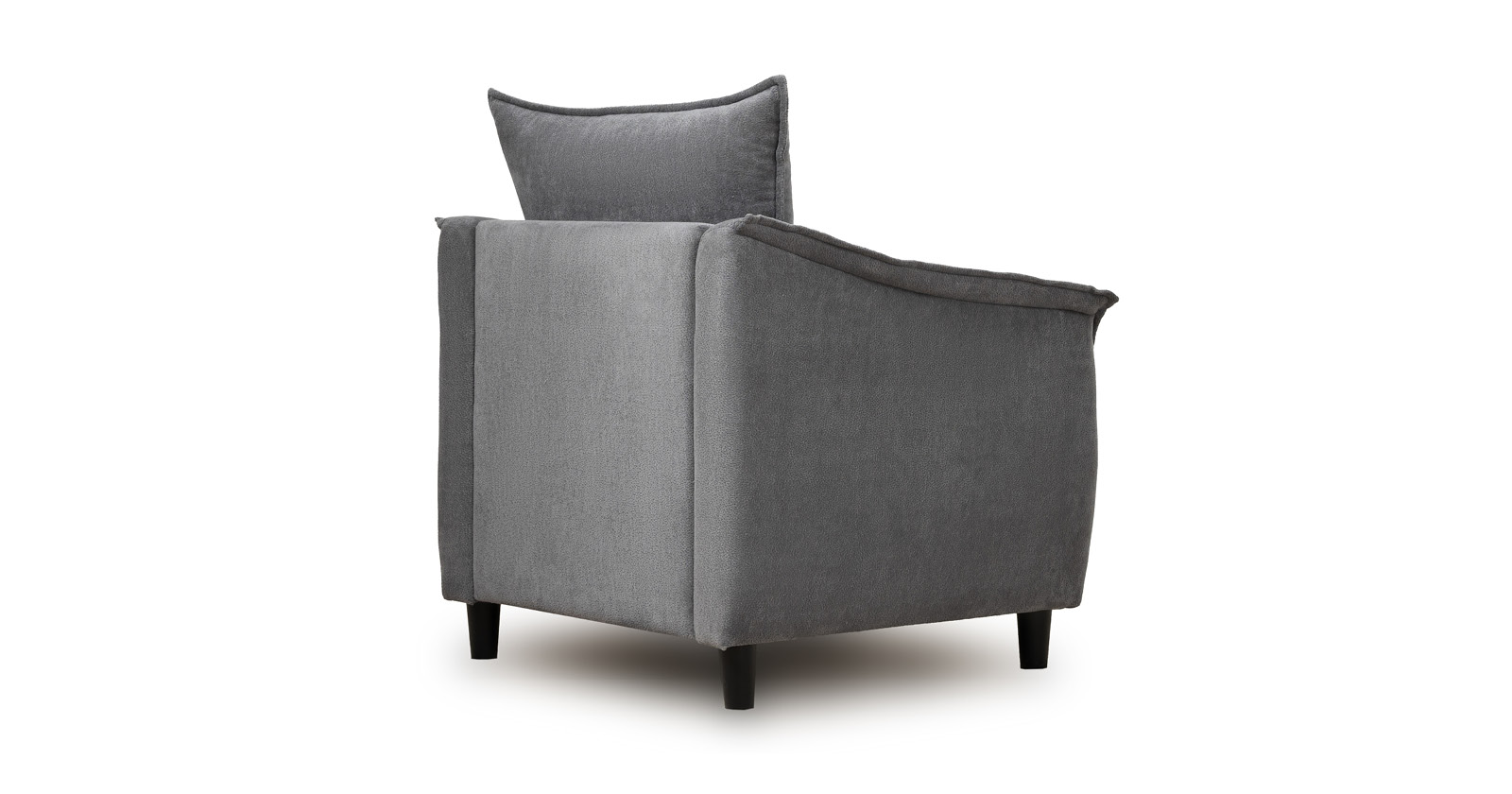 Кресло с приспинной подушкой трапецивидной формы на молнии, по трем сторонам которой проложена отделочная строчка на 1,2 см. По контуру боковин проложен декоративный кант на 1,2 см основной ткани. Кант проходит по центру передней части боковины, а по внутренней верхней части сборка.
