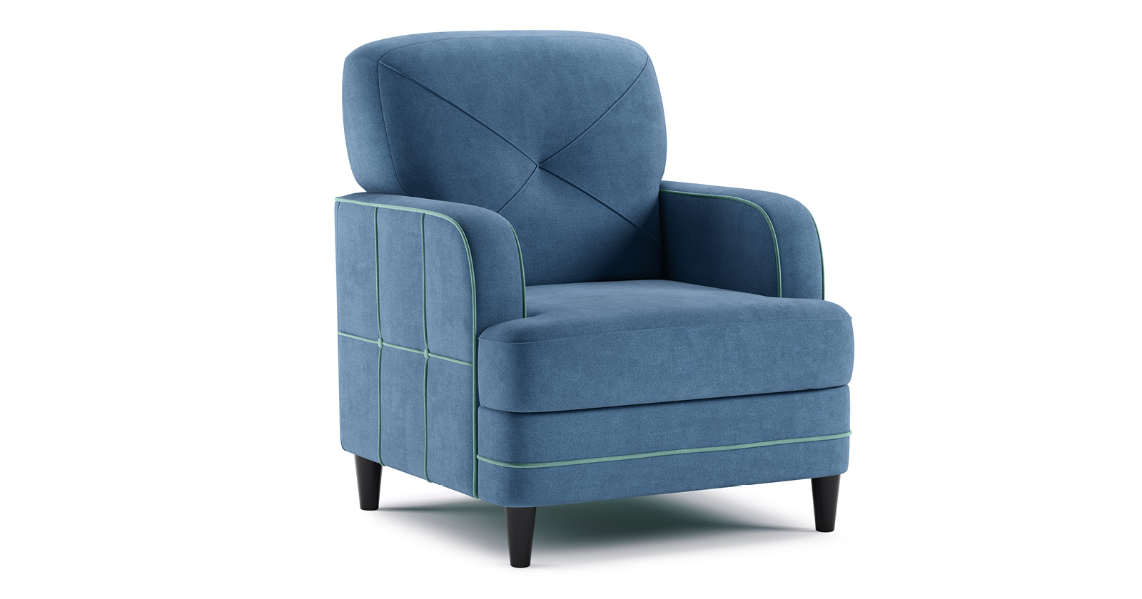 Декоративные канты на вставке подлокотников. Пуговицы в местах пересечения кантов на подушке и вставке подлокотников. По торцам подлокотников и думках контрастный декоративный кант. Защипы на сиденье и подушке.