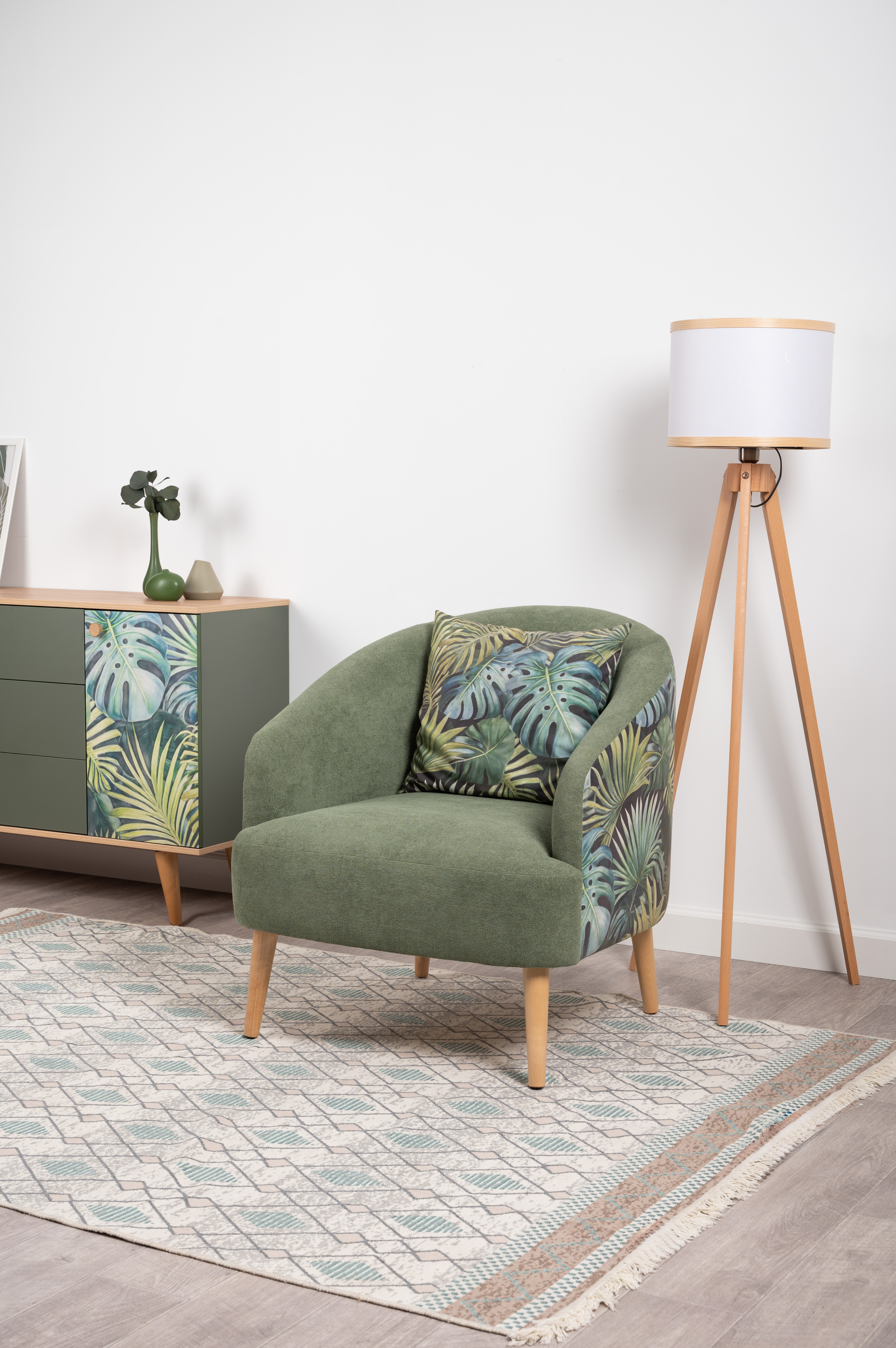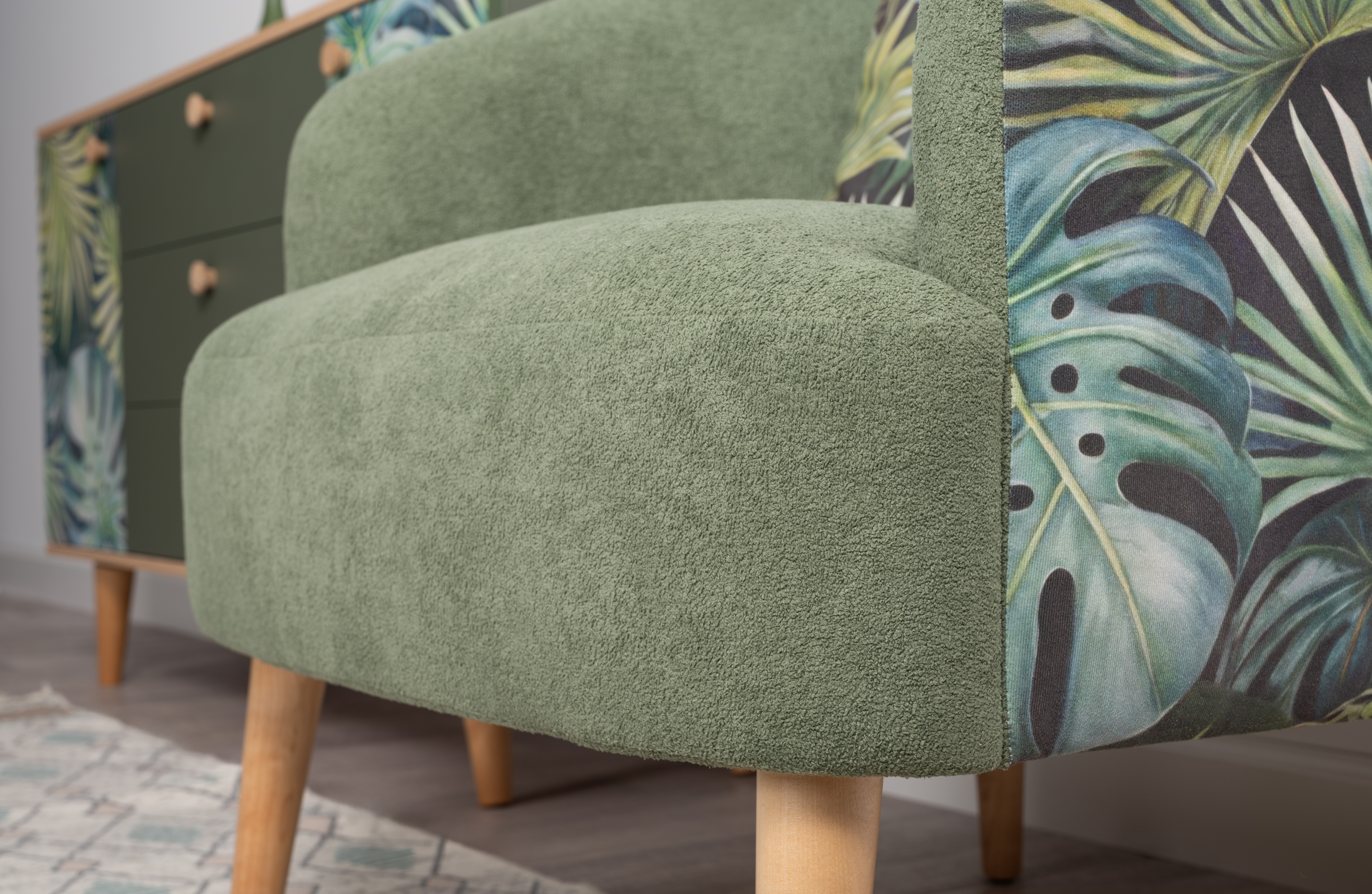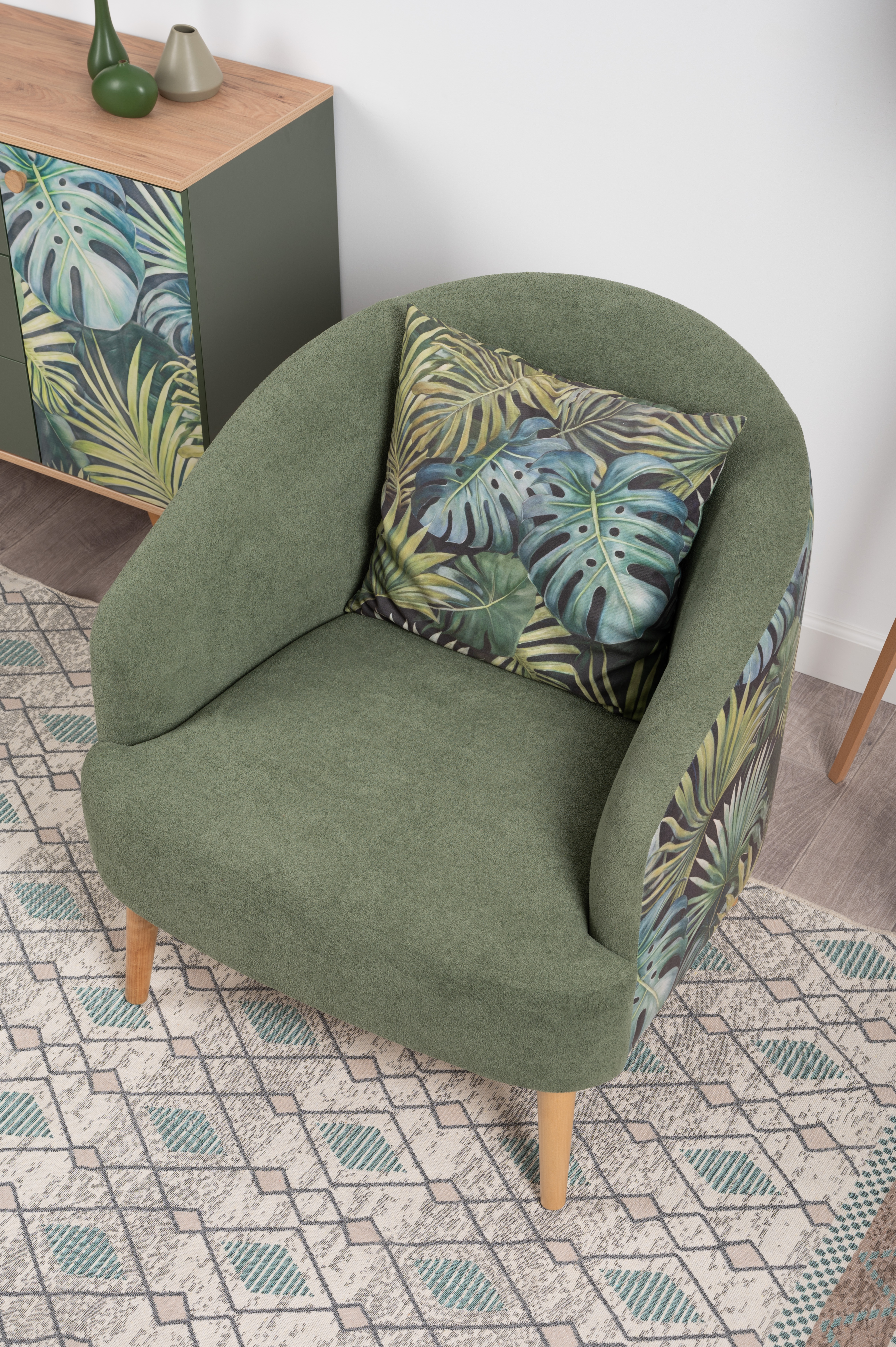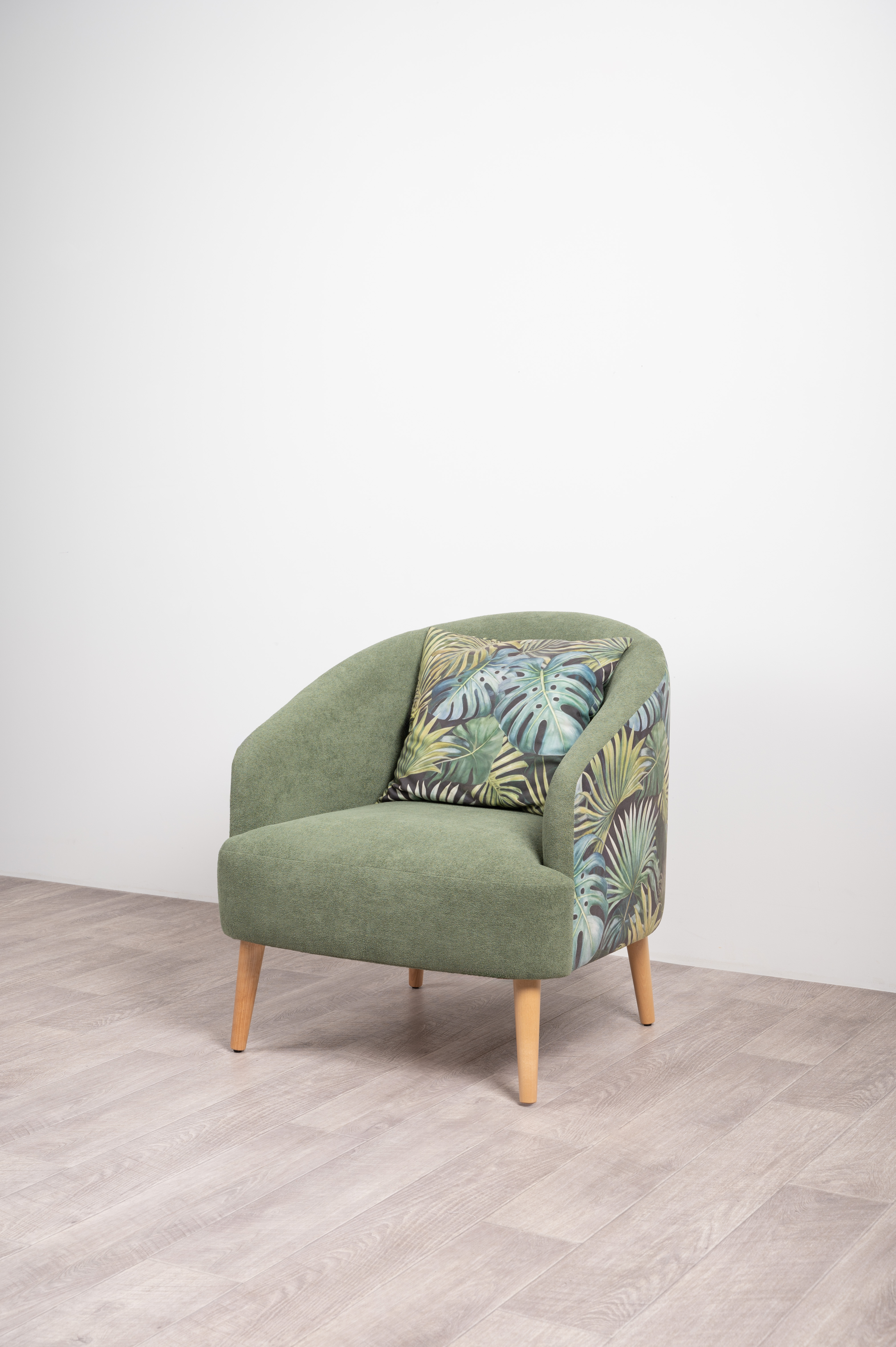 Маттиас — оригинальное кресло готовое стать акцентом в интерьере. Яркий тропический принт «монстера» на спинке мгновенно сделает комнату живой и современной.