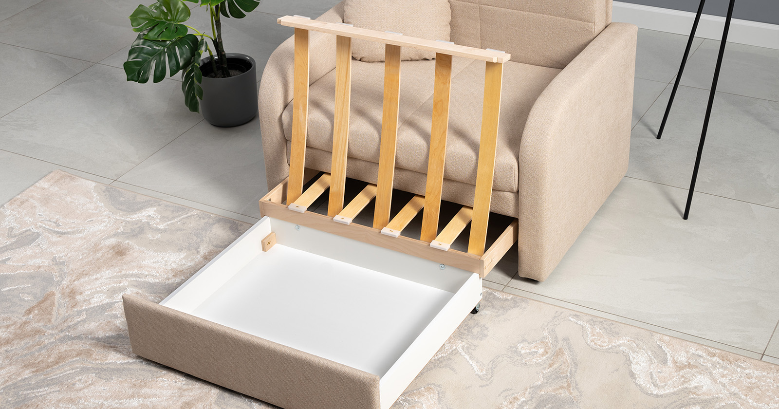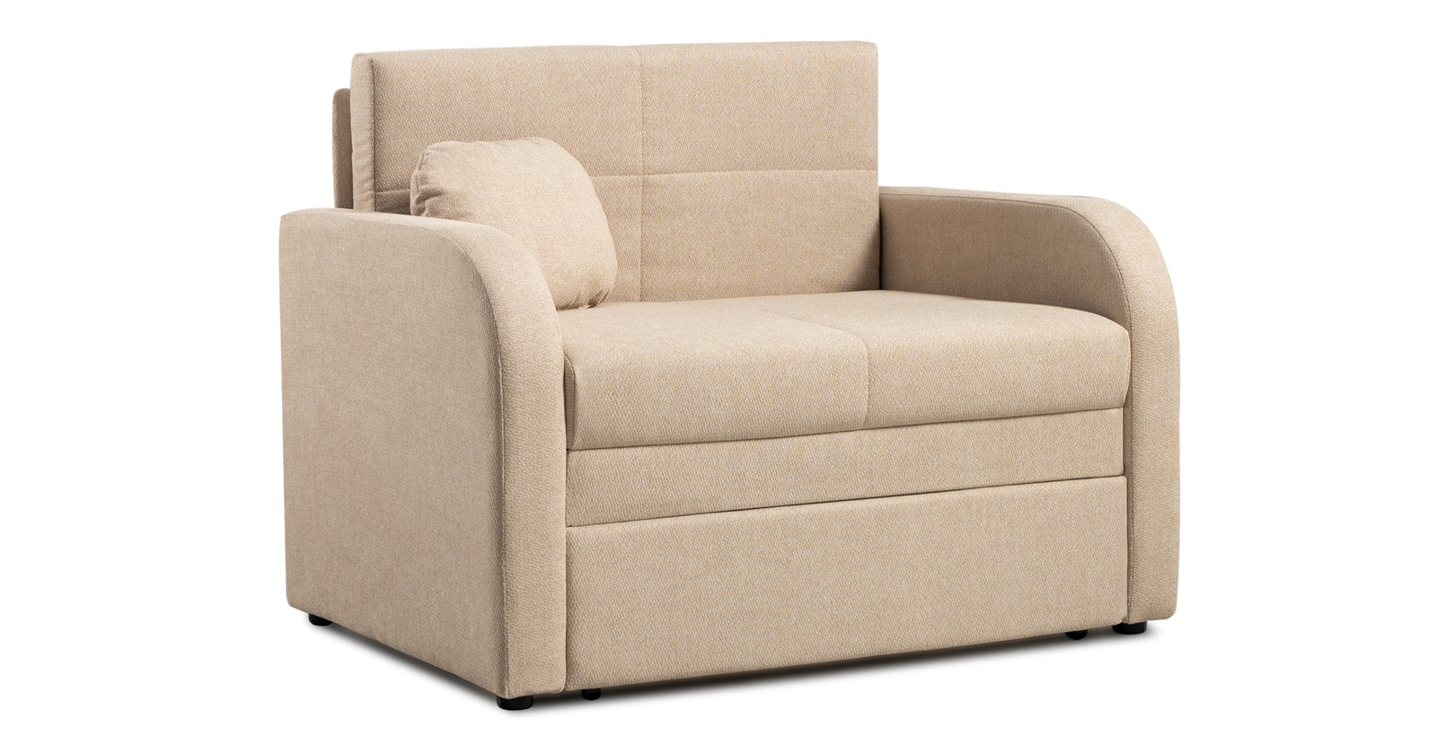 Коллекция выполнена в современном минималистичном стиле с мягкой обивкой из износостойкой ткани и декоративной стежкой, подчеркивающей геометрию форм. Механизм трансформации обеспечивает дополнительное спальное место, делая мебель не только эстетичной, но и максимально функциональной для небольших пространств.