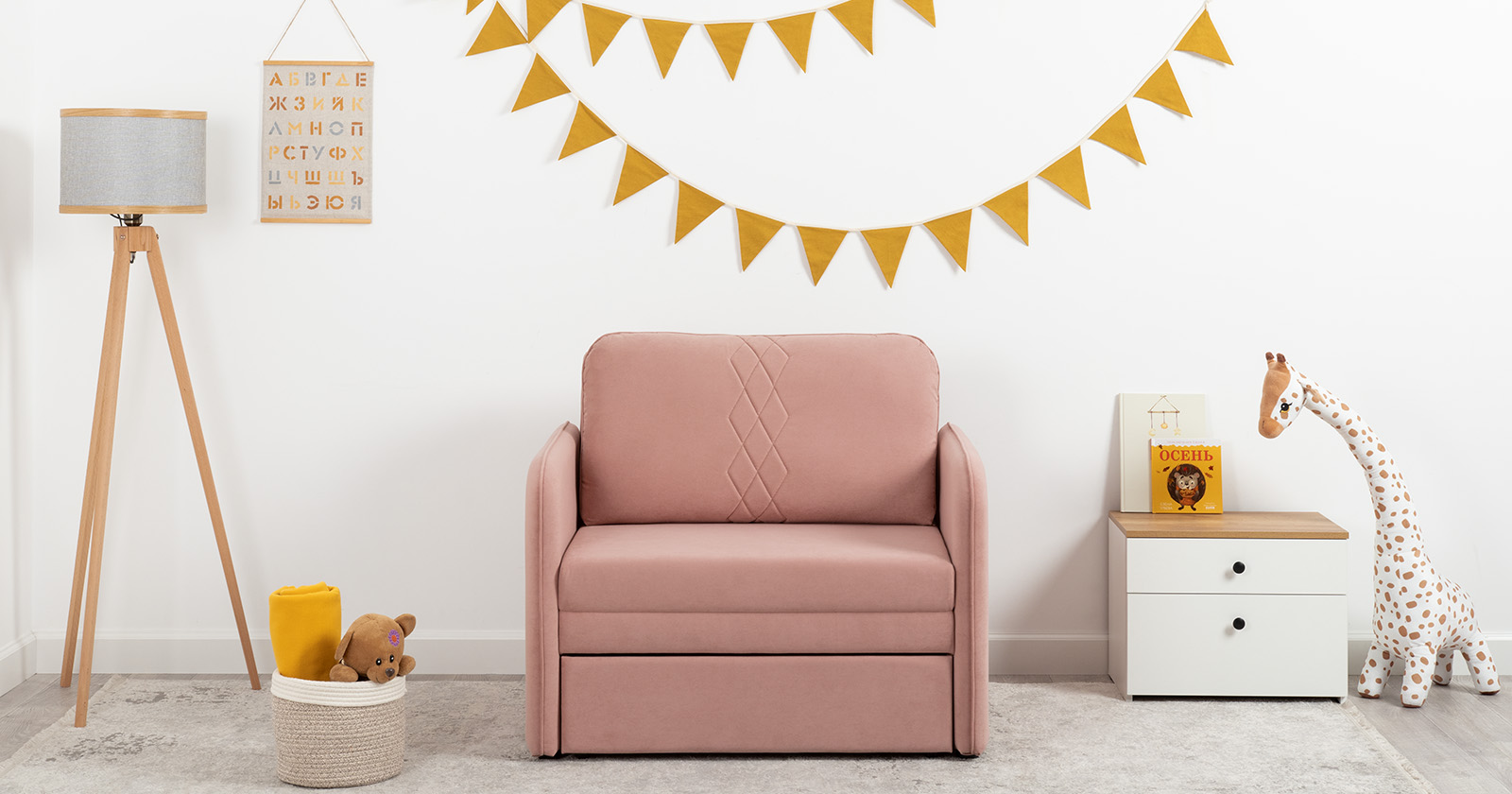 Стильный компактный диван для детской и гостиной. При своих скромных размерах он трансформируется в полноценное спальное место для детей и подростков. Лаконичный дизайн в виде декоративной стежки подчеркивает фактуру велюра, а небольшие размеры позволят разместить его в любом пространстве.
