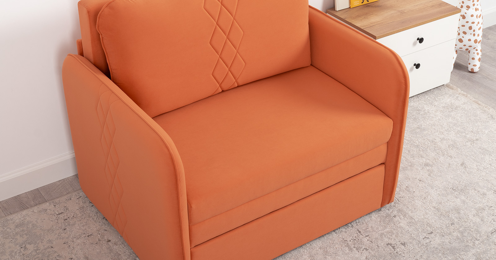 Стильный компактный диван для детской и гостиной. При своих скромных размерах он трансформируется в полноценное спальное место для детей и подростков. Лаконичный дизайн в виде декоративной стежки подчеркивает фактуру велюра, а небольшие размеры позволят разместить его в любом пространстве.