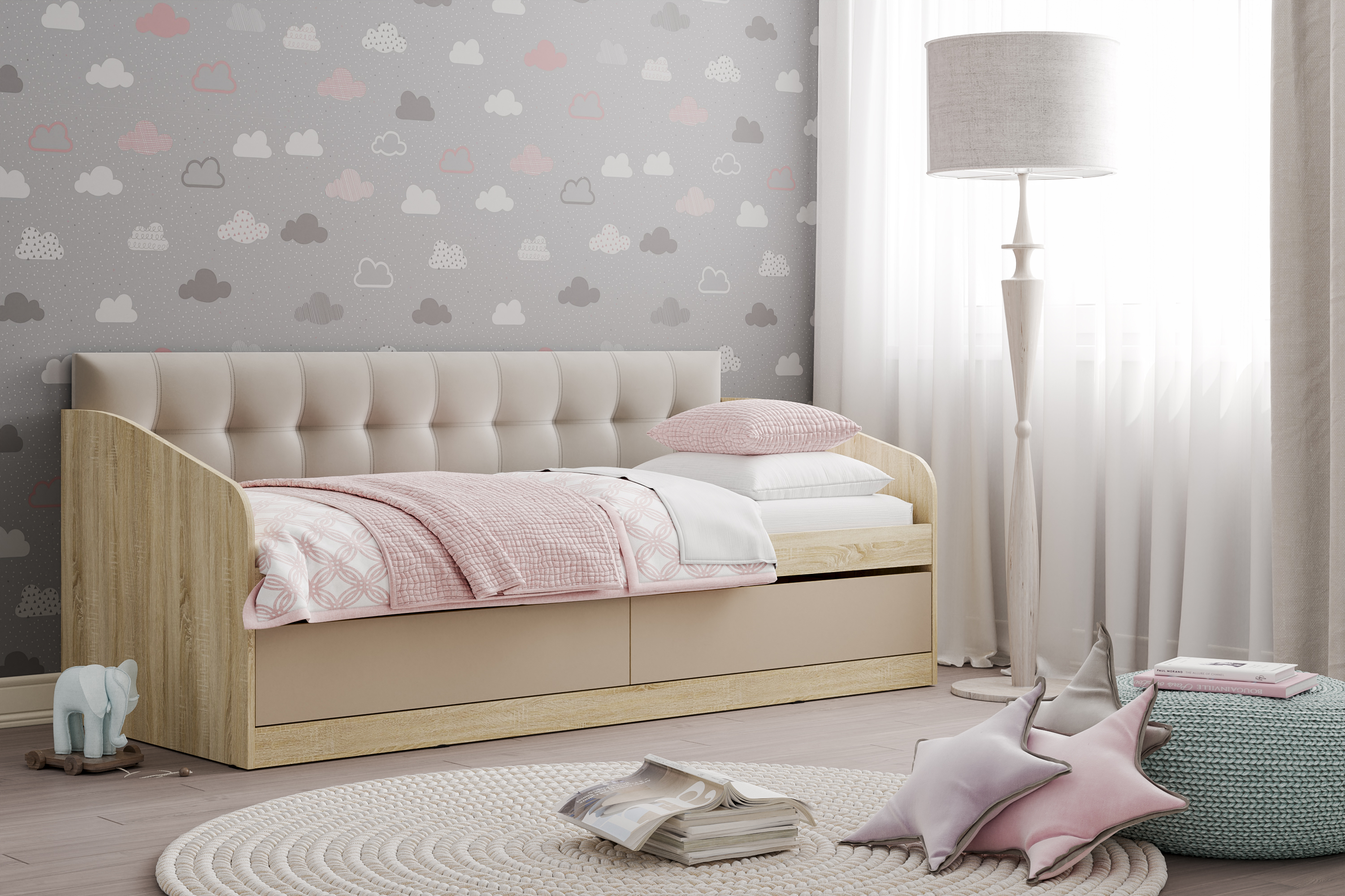 Кровать детская Акварель НМ 041.50-01 дуб сонома, капучино с мягкой спинкой Дабл велутто 16 велюр бежевый