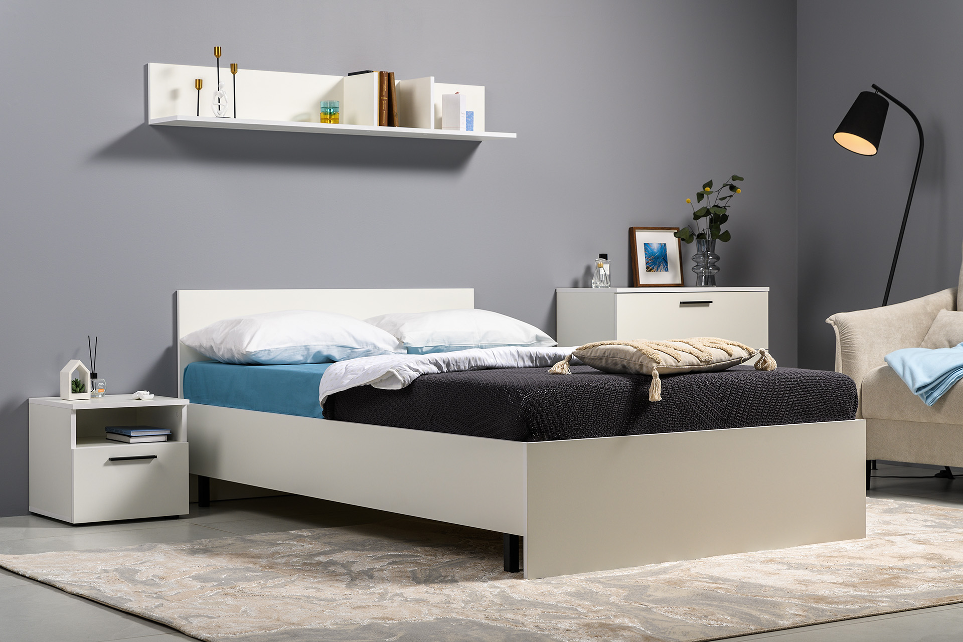 Два варианта кровати: ширина спального места 1200 и 1600 мм. Вместительный трёхстворчатый шкаф полноценной глубины с выдвижными ящиками и съемными полками. Ящики оснащены направляющими полного выдвижения.