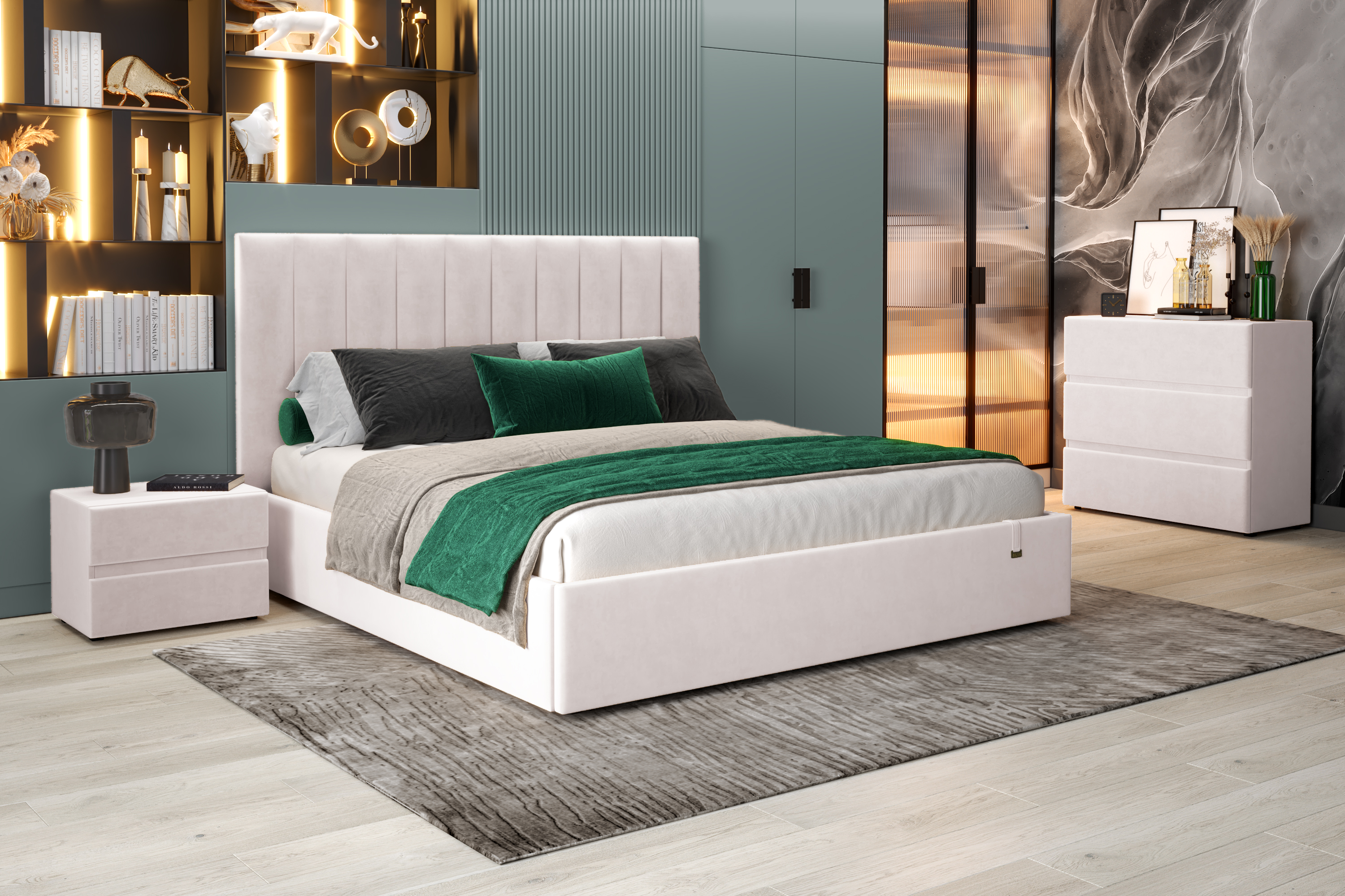 Подъемный механизм легок в управлении, а вместительный короб внутри кровати подойдет для хранения подушек, белья и других вещей. Мягкие тканевые ручки облегчают процесс подъема основания. Купить кровать можно удобным способом: оформить заказ в интернет- магазине, положив товар в корзину. С кроватями можно приобрести комод и тумбу «Ester». Ткань обивки возможно выбрать в цвет с кроватью, из представленных вариантов велюра.
