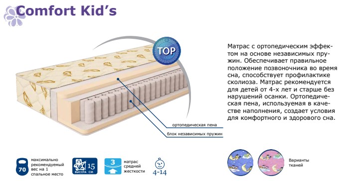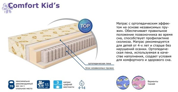 Матрас с ортопедическим эффектом  на основе независимых пружин. Обеспечивает правильное положение позвоночника во время сна, способствует профилактике сколиоза. Матрас рекомендуется для детей от 4х лет и старше без нарушений осанки. Ортопедическая пена, используемая в качестве наполнения создает условия для комфортного и здорового сна.