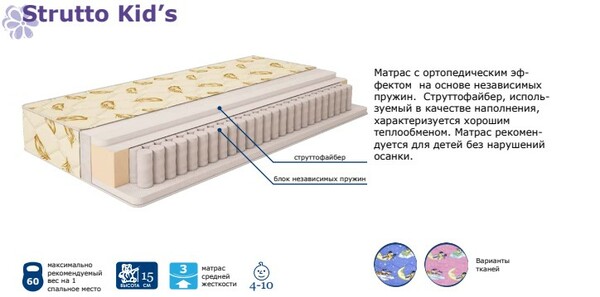 Матрас с ортопедическим эффектом на основе независимых пружин. Струттофайбер, используемый в качестве наполнения,характеризуется хорошим теплообменом, обладает теплозащитными свойствами, создает условия для комфортного и здорового сна. Срок службы таких матрасов достаточно высок - 12-15 лет. Съёмный чехол  из дышащей хлопковой ткани прекрасно подходит для нежной кожи малыша