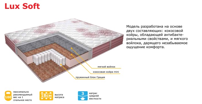 Модель разработана на основе двух составляющих: кокосовой койры, обладающей антибактериальными свойствами, и мягкого войлока, дарящего незабываемое ощущение комфорта.