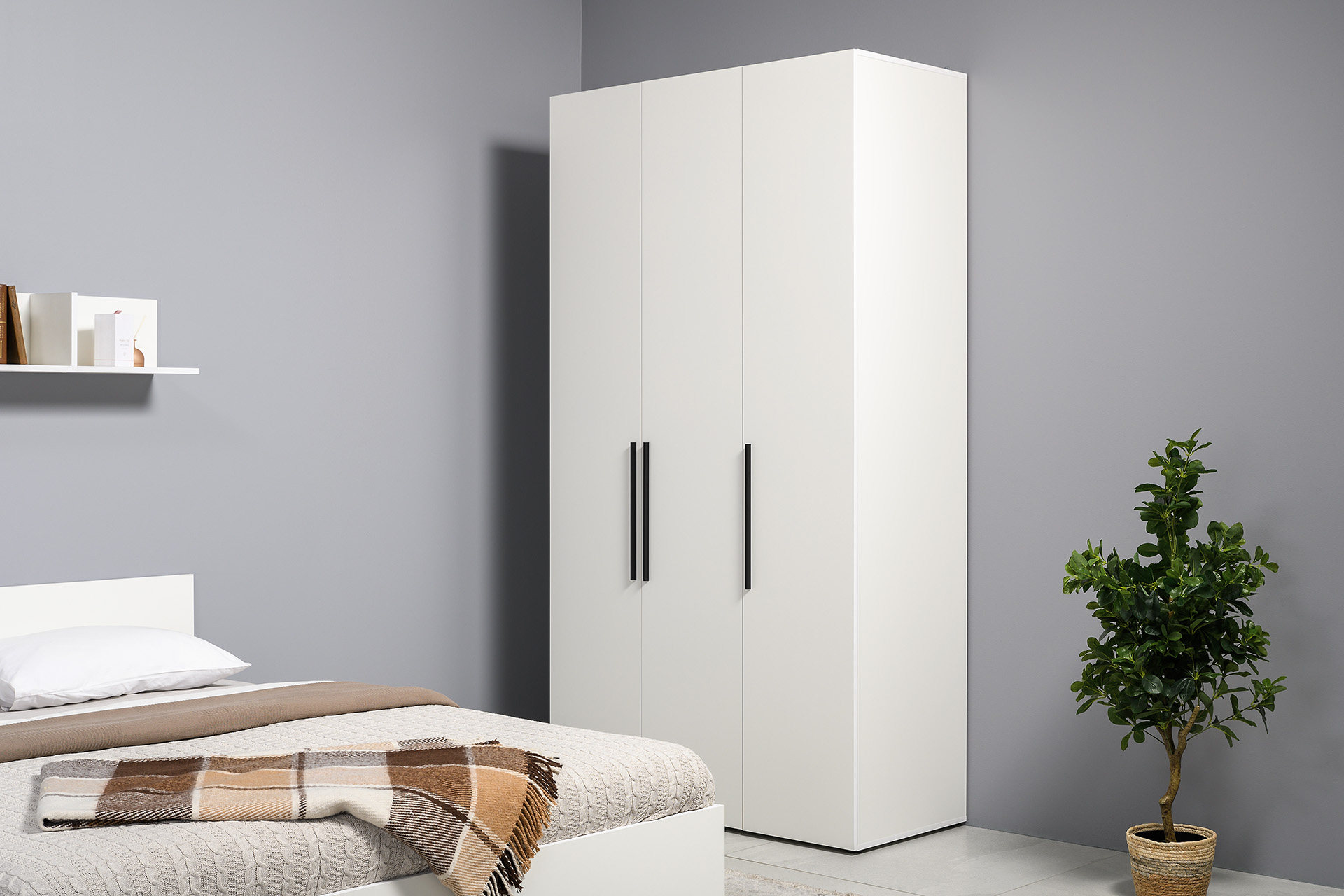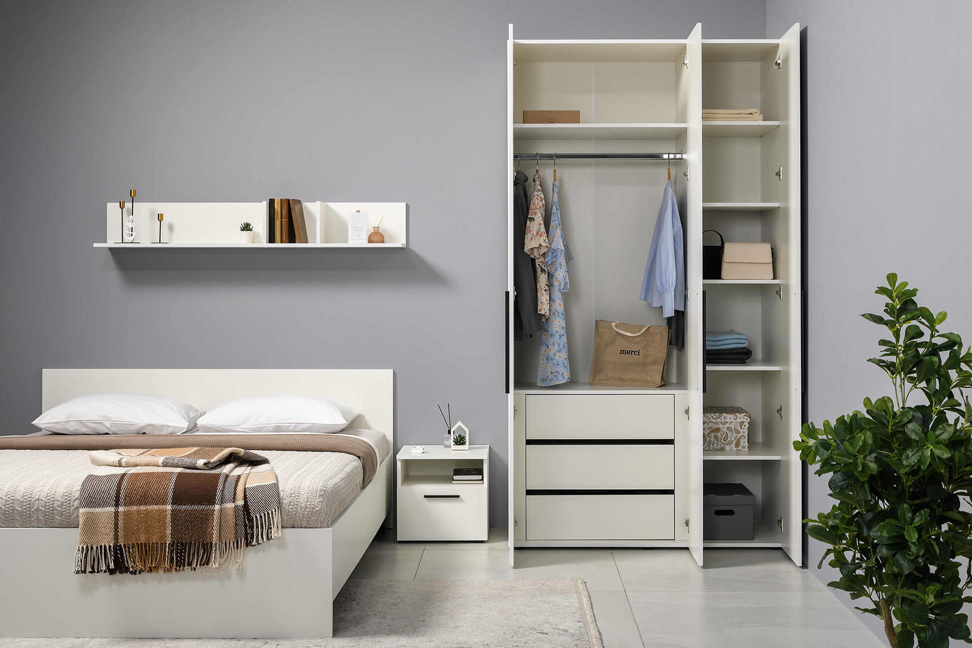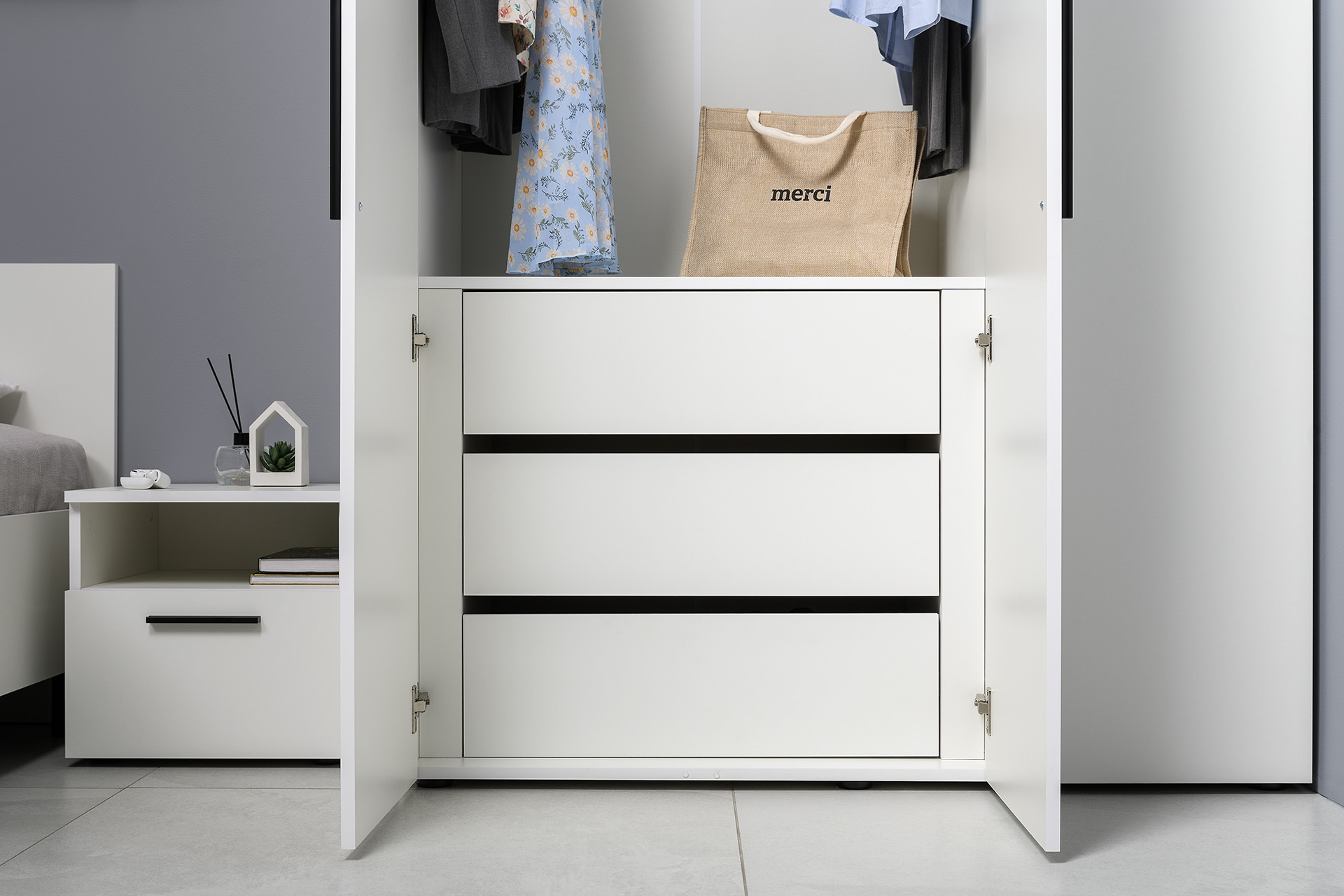 Два варианта кровати: ширина спального места 1200 и 1600 мм. Вместительный трёхстворчатый шкаф полноценной глубины с выдвижными ящиками и съемными полками. Ящики оснащены направляющими полного выдвижения.