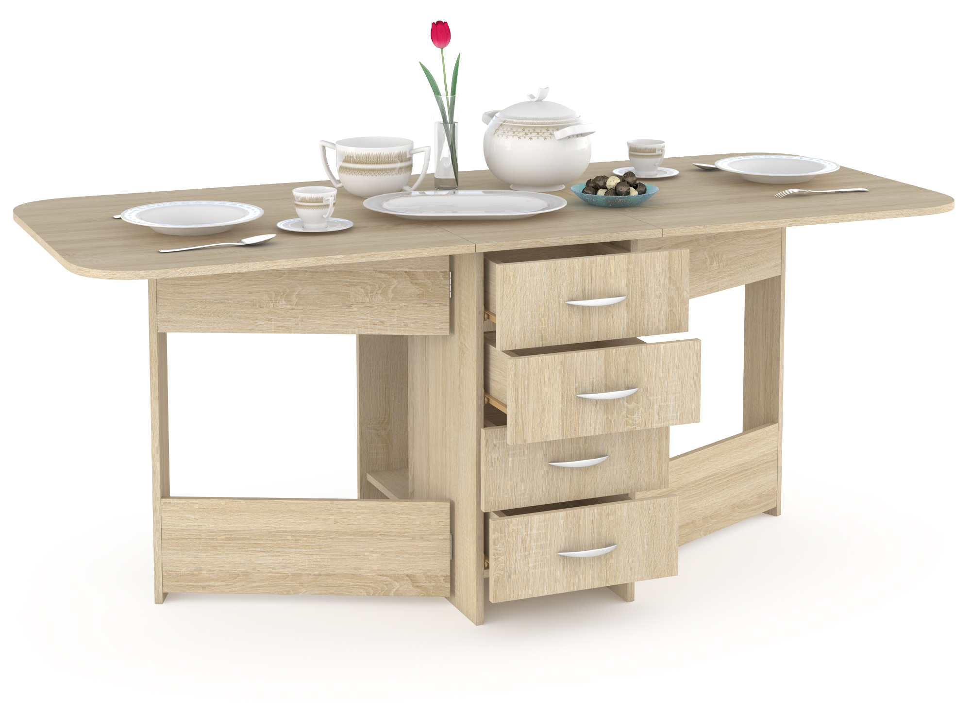 Четыре выдвижных ящика для хранения на роликовых направляющих, скругленные углы на столешницах, пластиковые ручки, размеры в сложенном виде (см): 42,4 х 78 х 75,3, размеры в разложенном виде (см): 182,6 х 78 х 75,3