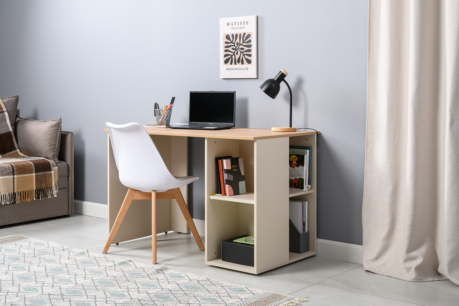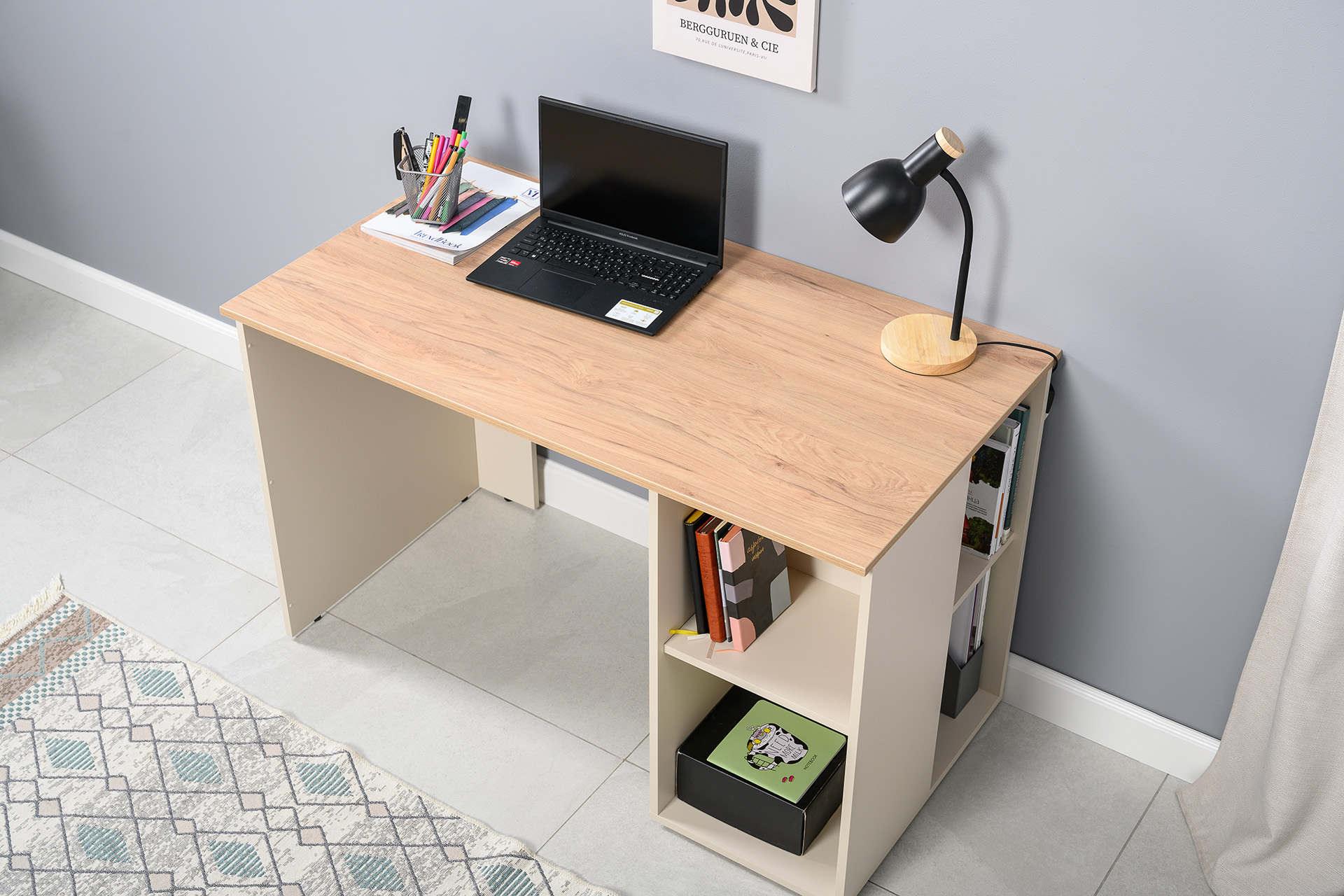 Стол письменный Лайт 12.163 сатин 7045 SU, гикори рокфорд натуральный KO86 PW, сборка на любую сторону, два варианта сборки тумбы